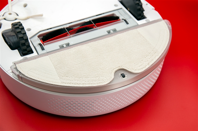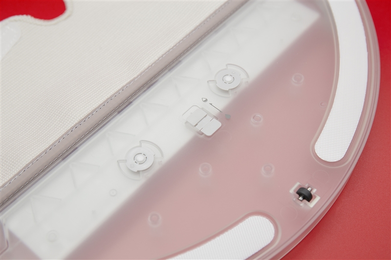 水箱打开橡胶塞即可加水。底面的抹布使用魔术贴和卡槽固定,更换起来也十分方便。如果不是沾染了重度污渍不好清理的话,自己拆卸下来清洗可以重复使用很久,经济实惠。撕开抹布,就可以看到两个出水孔和水流调节器,二档调节最多支持250㎡的清理。