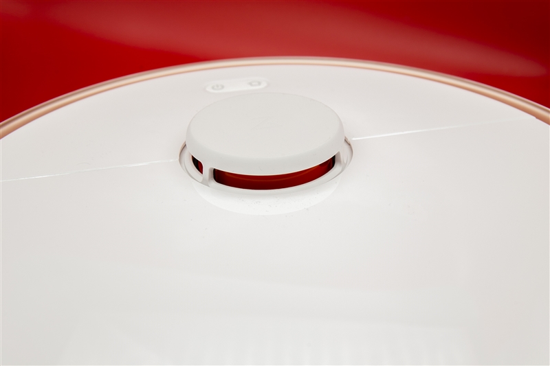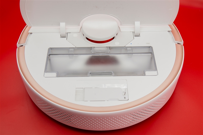 打开顶盖,可以看到尘盒和清洁刷。这里还隐藏有一个Wi-Fi指示灯和一个重置按钮。