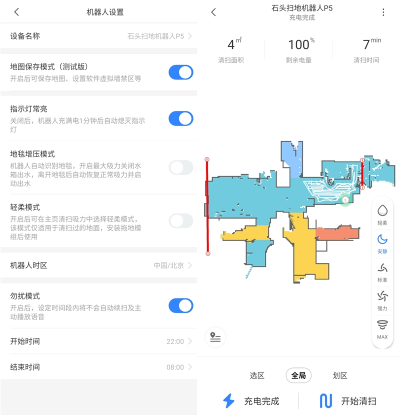 此外,在前面的截图中,你可以一直看到一个充电完成的按钮。石头扫地机器人P5可以通过APP管理充电,电量低时取消在房间待机,点击开始回充,它就会回到充电座。