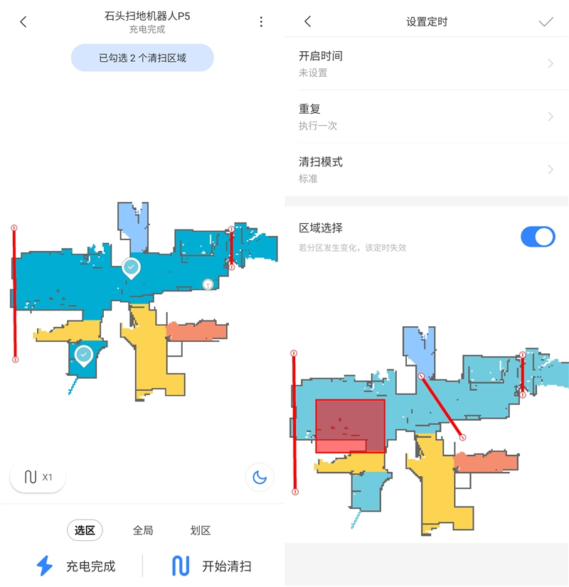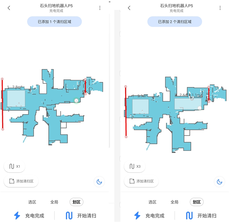 石头扫地机器人P5增加了划区清扫的功能,在生成地图的同时,会区分不同的房间加以标识。而在后期的使用过程中,你可以针对不同的房间设定不一样的清扫任务,利用定时清扫功能与智能划区相配合,就可以实现高度定制的清扫计划;或者仅仅是哪个房间脏了,就点击区域执行清扫,比原来智能整屋清扫或是自己划定区域更方便。