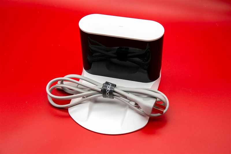附赠的充电底座和电源线。安装到墙边即可让扫地机器人自动回充。