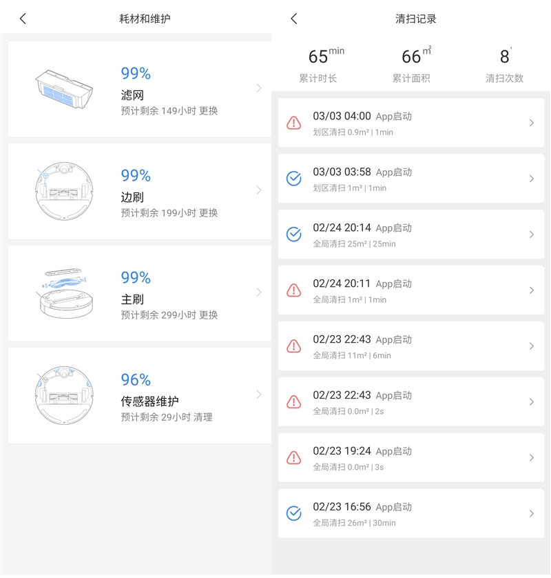 当然,像刷头、尘盒、滤网都属于消耗品。在石头扫地机器人P5的APP中,对于这些消耗品的寿命也有详细的记录,能够得知剩余的使用时间大概为多久。APP中同样提供了清扫记录,方便你发现耗材消耗异常时通过清洁记录查询原因。