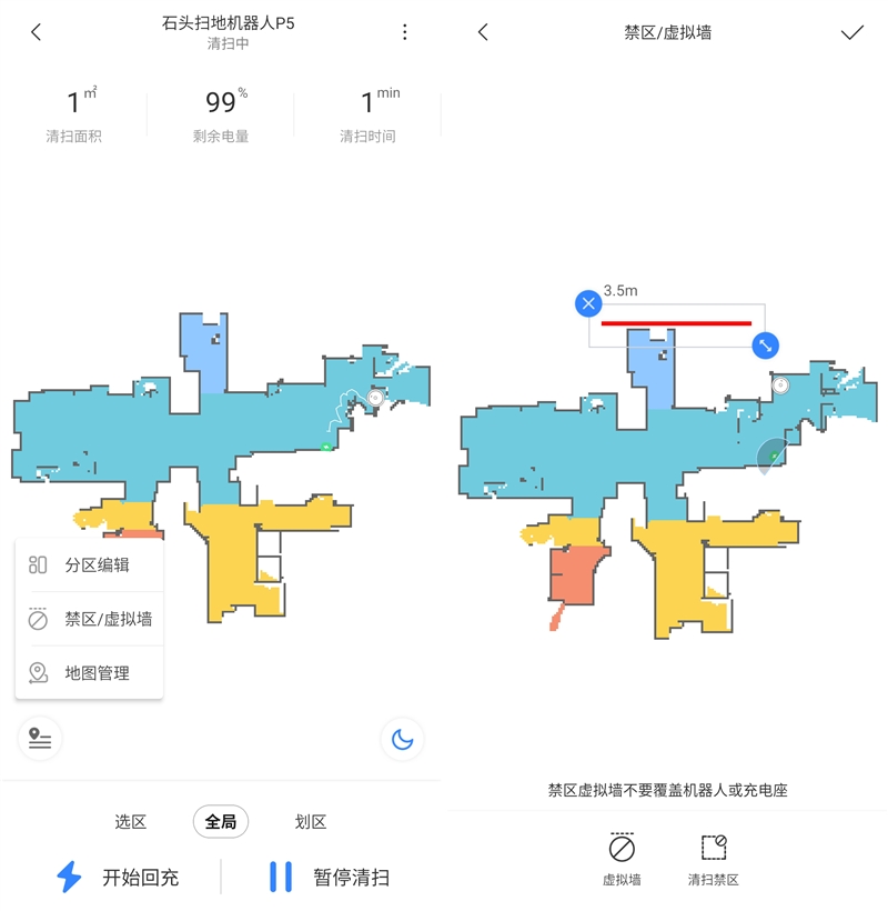 扫描出的地图可不是个花架子。你可以直接在地图上进行编辑为机器人设置禁区等。比如当你不想让机器人进入厨房或厕所时,就可以设置一道虚拟墙,使扫地机器人到达时自动折返。而禁区功能,更适用于一些特殊情况,比如一个房间角落杂物过多,直接设置禁区就可以让机器人避开清扫。