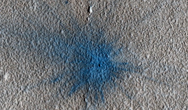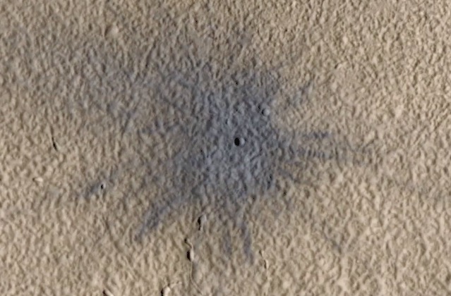 2010年中期HiRise团队在对该陨石坑和它的黑暗喷射带进行了近距离观察并拍照留存,然后于2019年12月在同一地点重新拍摄了一张照片,照片中发现浅色的尘埃已经覆盖了陨石坑的痕迹。