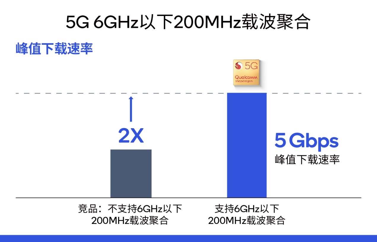 除了毫米波,骁龙865在6GHz以下频段也能够提供无与伦比的速度和覆盖范围。凭借对200MHz频谱载波聚合的支持,骁龙865在6GHz以下频段的峰值速率是竞品旗舰解决方案的2倍,提供高达5Gbps的下载速率。近期,我们利用骁龙X55调制解调器及射频系统,通过6GHz以下TDD模式的200MHz载波聚合,实现了3.6Gbps的速率。