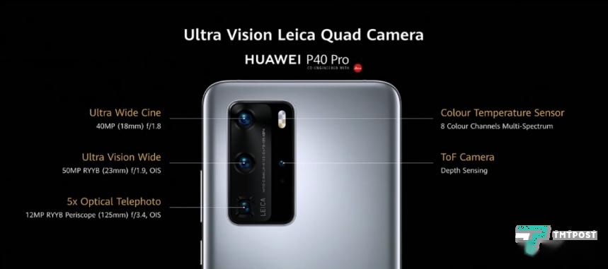 P40 Pro采用徕卡四摄像头系统,主摄像头加入了OIS防抖功能,其他参数相同,广角镜头采用4000万像素电影摄像头,等效焦距18mm,光圈为f/1.8,长焦镜头为1200万像素,支持5倍光学变焦与OIS防抖,采用RYYB阵列,光圈为f/3.4,此外新增加了一颗ToF景深摄像头。