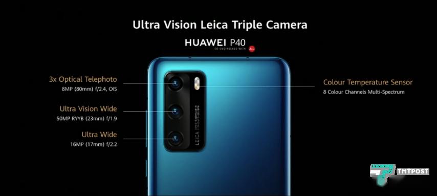 P40采用后置徕卡三摄像头系统,主摄像头为全新的5000万像素传感器,采用RYYB排列,传感器尺寸达到了1/1.28英寸,等效焦距为23mm,光圈为f/1.9。另外两颗摄像头分别为1600万像素超广角镜头,等效焦段17mm、光圈f/2.2,以及一颗800万像素长焦摄像头,支持3倍光学变焦与OIS防抖功能。