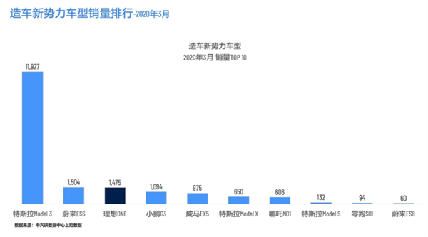 在造车新势力中,理想ONE排在第三位,一二名分别是特斯拉的 Model 3 和蔚来 ES6。