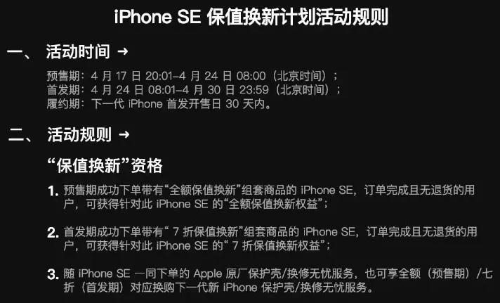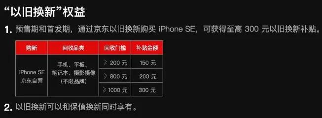 京东则推出了专属福利之iPhone SE保值换新计划,抵扣力度大到可以全额折抵(这个我很怀疑现实中有会发生)。同时还有以旧换新的方案,以旧换新的最高额为300。这一点,显然是不如拼多多交个朋友的力度。