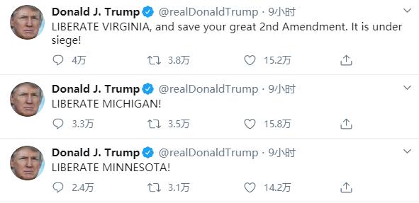在这一系列推文中,特朗普呼吁"解放明尼苏达州"、"解放密歇根州 "和 "解放维吉尼亚州,保有伟大的宪法第二修正案赋予你们的权利。它正在受到封锁!"