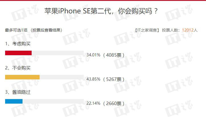 根据IT之家网站的投票结果,截至发稿时,有12012人投票,其中有34.01%的用户选择考虑购买,有43.85%的用户选择不会购买,有22.14%的用户打酱油路过。总体看来,苹果 iPhone SE 第二代因为小屏幕、旧设计、单相机、不支持5G等,不少用户选择忽略或观望。