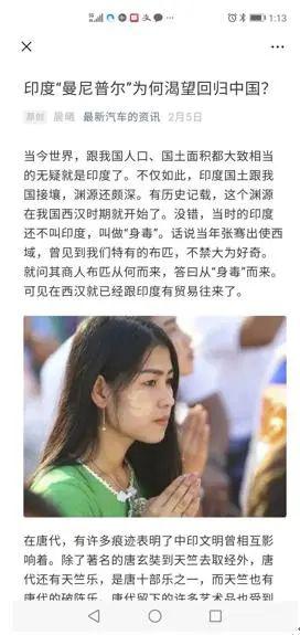 该公众号一篇题为《印度“曼尼普尔”为何渴望回归中国》的文章称,有历史记载,印度“曼尼普尔”的渊源从我国西汉时期就开始了,文章最后称,“虽然他们身在‘曹营’,但是一直渴望回到祖国。”