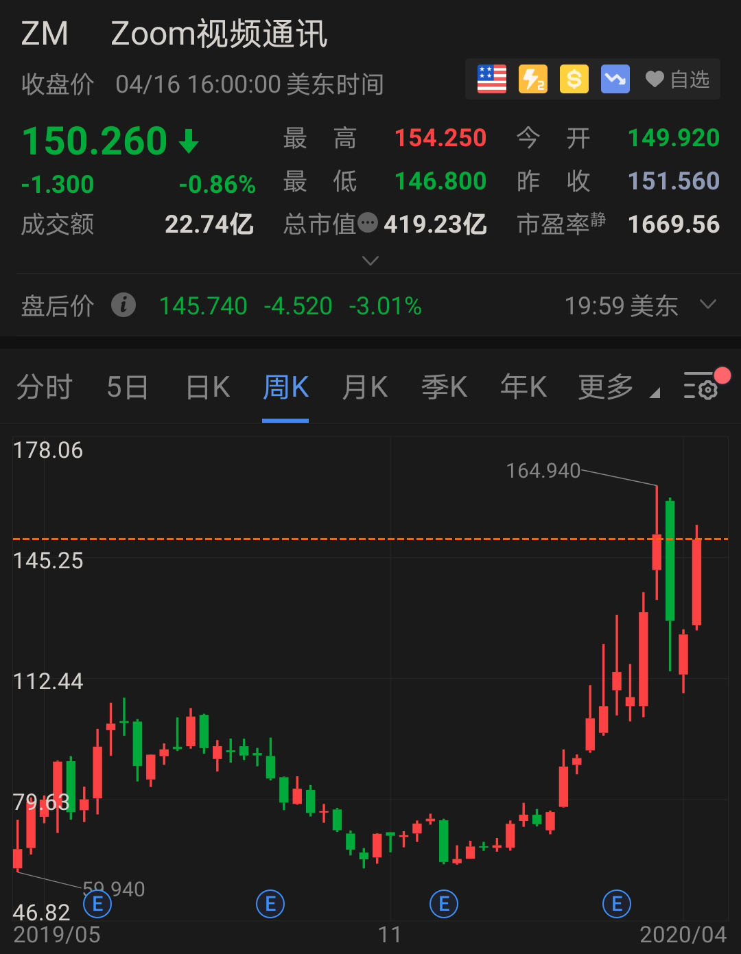 虽然其股价在4月有所回落,但随后又重新上升。截至4月16日收盘,Zoom股价报150.26美元/股,接近历史高位。
