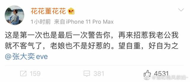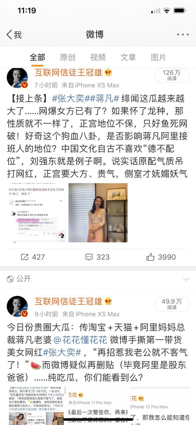 一个ID为@花花董花花 的美女在微博上公开艾特警告张大奕,“再招惹我老公就不客气了!”发帖者被迅速爆出疑似蒋凡妻子。蒋凡是谁?现任天猫+淘宝+阿里妈妈的总裁啊,甚至被业内认为是阿里巴巴集团的“太子”。(内幕请戳《王兴隔空钦定阿里太子,蒋凡黄袍锅从天降》)