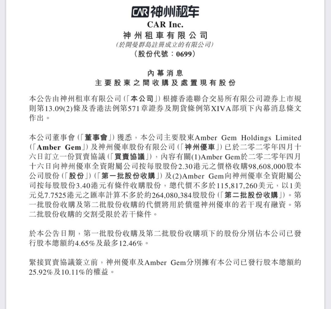 昨日夜间,神州租车发布公告表示,公司主要股东Amber Gem及神州优车已于2020年4月16日订立一份买卖协议。