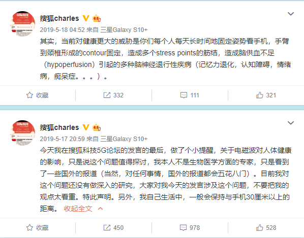 去年5月,搜狐董事局主席张朝阳就谈到毫米波5G辐射问题,“到了毫米波,对微波转播的高频率几千兆赫兹,在这种情况下根据我的物理知识,这个频率其实对人体危害是更大的。”这在当时引起媒体广泛报道,不过后来张朝阳说“我收回这句话,自己只是看到一些报道,还需要专家进一步研究。”