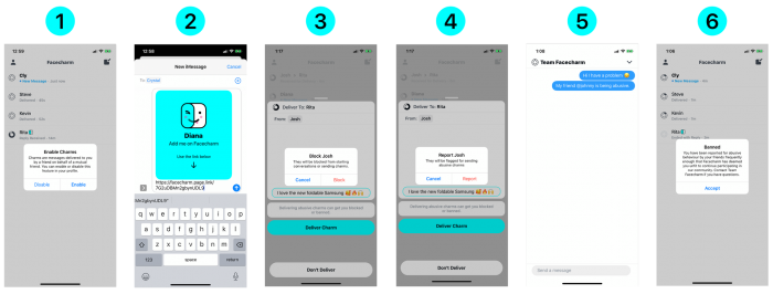 App Store指南规定,社交应用应该提供屏蔽和举报辱骂性内容的选项,因此Martin再次更新了Facecharm。