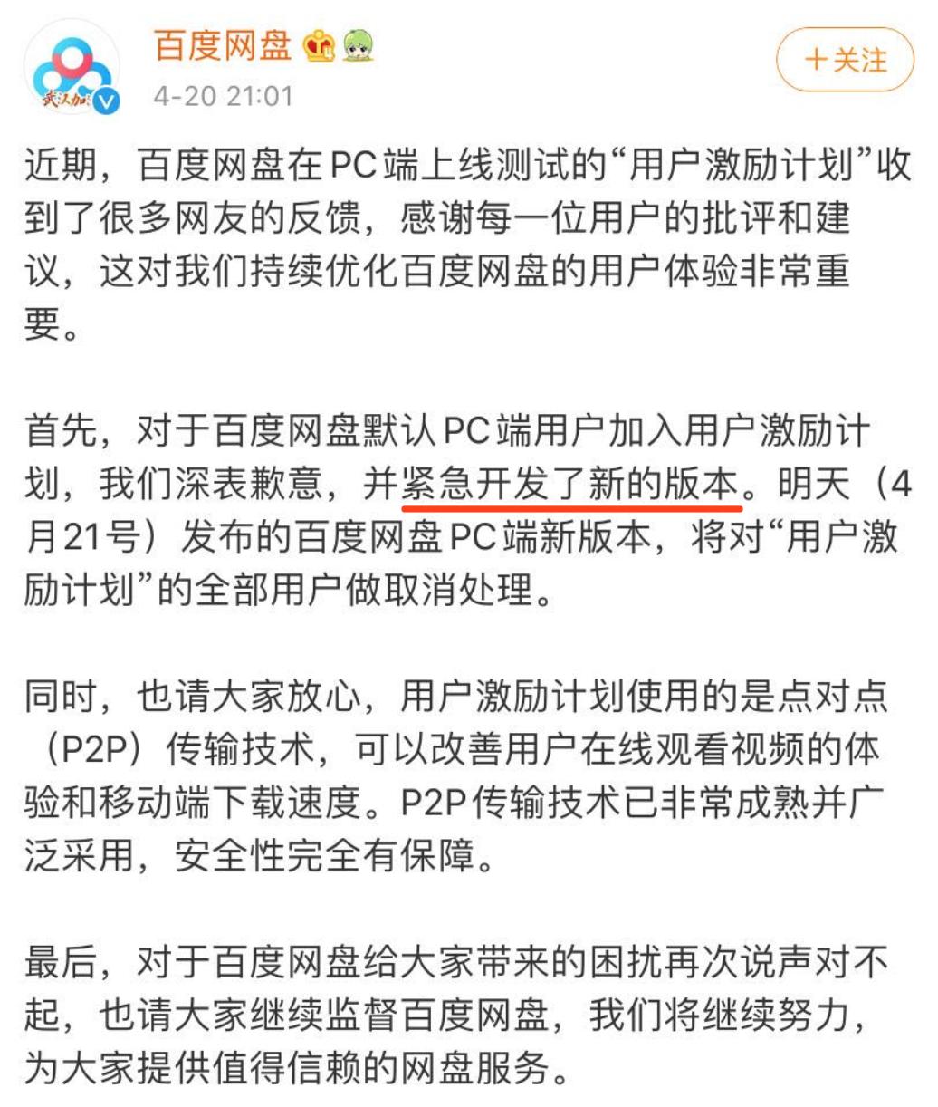 事情爆出后引起了用户的强烈不满,百度网盘在微博上发道歉信并承诺立马发布新版本修改这个错误。