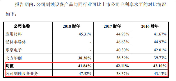 毛利率方面,中微公司在招股书中介绍,2016年和2018年其刻蚀设备业务的毛利率基本保持在40%以上,与应用材料、泛林半导体、东京电子三大国际刻蚀设备巨头大体相当,略高于国内A股可比上市公司北方华创;2017年受营收规模下降、客户补偿等因素的影响,毛利率有所下降。