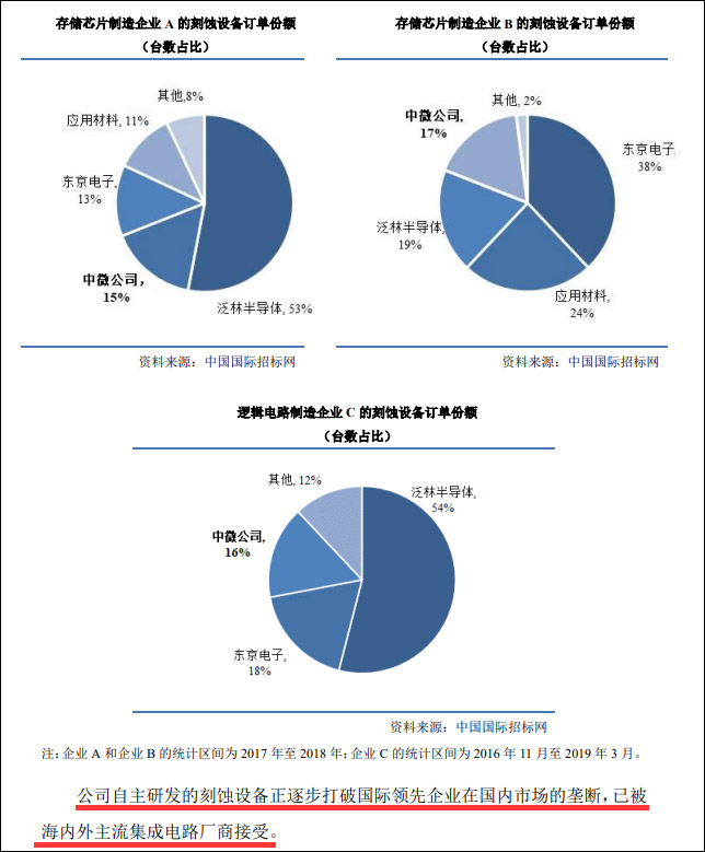 招股书中显示,2017-2018年两家国内知名存储芯片厂商采购的刻蚀设备台数订单份额中,中微公司分别占比达15%、17%,其自主研发的刻蚀设备正逐步打破国际领先企业在国内市场的垄断。