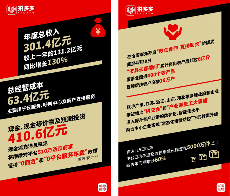 拼多多在年报中表示,目前尚无法合理估算COVID-19对于平台发展前景的影响,为应对可能存在的不确定性,企业做好了充足的现金储备。