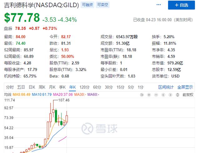 最新美股收盘,那个搭上疫情概念股顺风车的吉利德科学(以下简称吉利德)却跌停了。截至4月23日,吉利德盘中跳水,跌幅超4%,收盘总市值为979亿,较前一日市值蒸发44亿美元(约合310亿元人民币)
