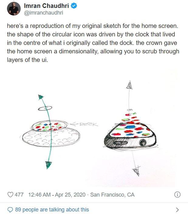 Chaudri 分享了一张他为 Apple Watch 的主屏幕绘制的原始草图的复制品,圆形图标形状的灵感来自于原本被称为底座的时钟。在推出之前,数字触控(Digital Touch)功能被称为 "电子触控"(Electronic Touch),因为它有可能成为一种 "新的情感连接形式"。而在表盘上绘画的 “水墨”灵感来自于Chaudhri的涂鸦时代。