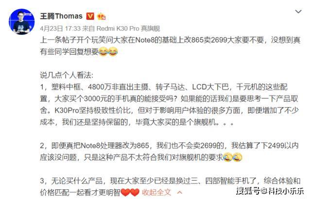 没想到的是王腾竟然发了一篇微博,微博表示:如果Redmi Note 8的处理器改为骁龙865卖2698元如何?这,啥操作啊,嘲讽iQOO Neo简配吗?难道连iQOO也要酸吗?现在的小米还不至于这样吧。
