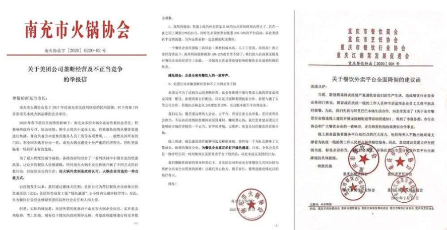 广东餐饮协会所言非虚,疫情期间,美团外卖就遭到了多地餐饮协会的联合声讨,2月20日,四川省南充市火锅协会以公开信形式,举报美团存在突然提高佣金,同时要求商家参与优惠活动,以及承担部分配送费。重庆、河北、云南、山东等地行业协会,也发布公开信,呼吁外卖平台降低外卖佣金费率。