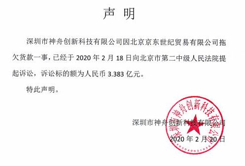 今天下午,神舟电脑宣布正式起诉京东拖欠贷款3.383亿元,神舟电脑在声明中表示:深圳市神舟创新科技有限公司因北京京东世纪贸易有限公司拖欠货款一事,已经于2020年2月18日,向北京第二人民中级法院发起诉讼,诉讼的金额为3.383亿元。