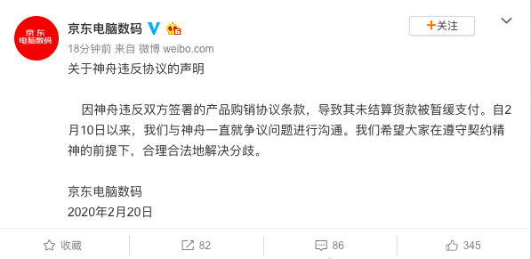 针对神舟电脑起诉京东拖欠3.383亿元一事,京东电脑数码通过官方微博发布声明称, 因神舟违反双方签署的产品购销协议条款,导致其未结算货款被暂缓支付。自2月10日以来,我们与神舟一直就争议问题进行沟通。我们希望大家在遵守契约精神的前提下,合理合法地解决分歧。
