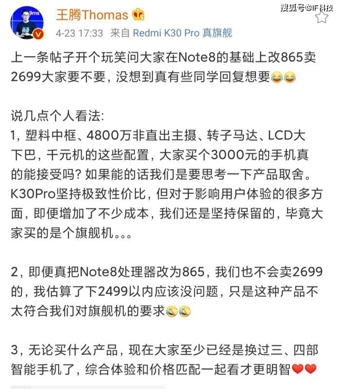 对于iQOO把一款骁龙865产品卖到2698元,王腾也说出了他个人的几点看法,首先,iQOO Neo 3是塑料中框、4800万非直出主摄、转子马达、LCD大下巴,千元机的这些配置,大家买个3000元的手机真的能接受吗?如果能的话我们是要思考一下产品取舍。K30Pro坚持极致性价比,但对于影响用户体验的很多方面,即便增加了不少成本,我们还是坚持保留的,毕竟大家买的是个旗舰机。即便真把Note8处理器改为865,我们也不会卖2699的,我估算了下2499以内应该没问题,只是这种产品不太符合我们对旗舰机的要求。无论买什么产品,现在大家至少已经是换过三、四部智能手机了,综合体验和价格匹配一起看才更明智。