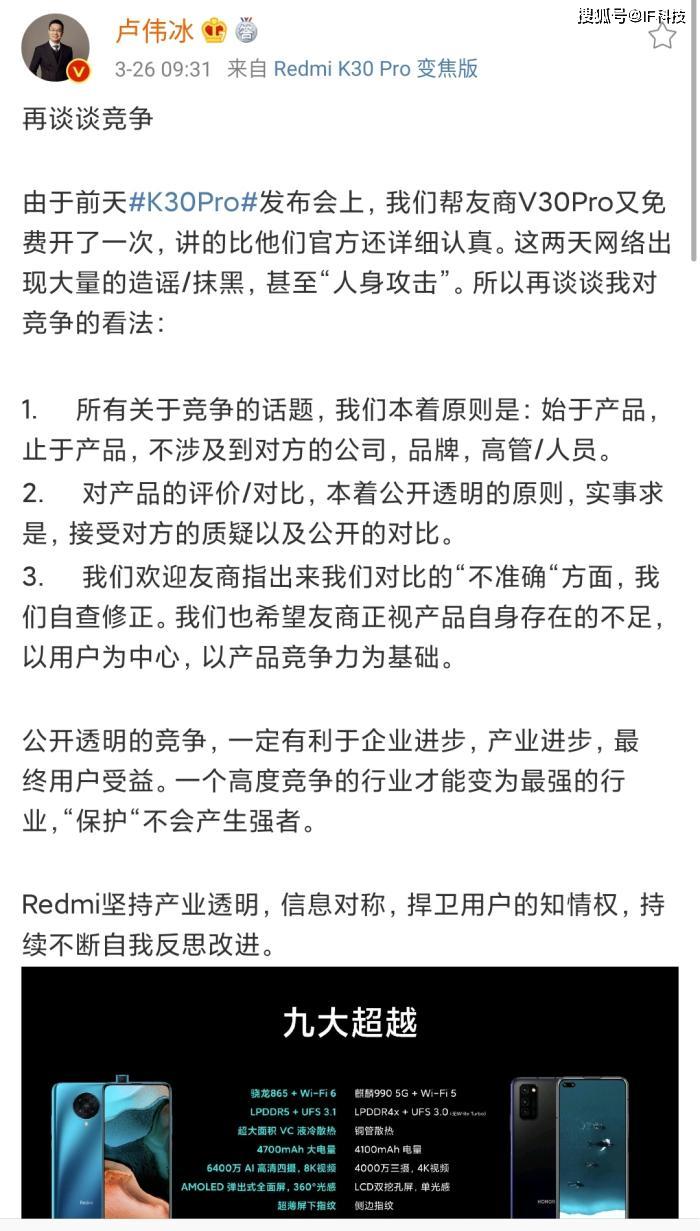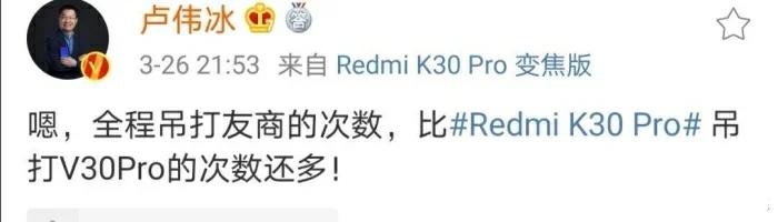 值得一提的是,荣耀高管因为自家产品被友商在对比后却坐不住了,根据了解,卢伟冰在Redmi K30pro发布会上,将友商V30pro拿来对比,通过真实数据,K30pro确实全局领先V30pro。后来荣耀高管申开朗发文嘲讽卢伟冰很悲愤,一场新机发布会怼了友商68次,再次嘲讽其怼天怼地怼世界。然而申开朗发了这条动态之后,立刻遭到网友嘲讽,称其又一次双标,因为荣耀每次进行发布会也是怼友商,只允许荣耀怼友商不允许友商怼荣耀?