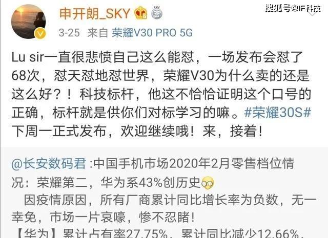更让申开朗头疼的是,卢伟冰直接公开表示华为p40发布会“吊打”友商的次数,比Redmi K30pro吊打V30pro的次数还多。显然荣耀高管用这种话来嘲讽卢伟冰悲愤、怼天怼地怼世界就是在嘲讽余承东怼天怼地怼世界。p40系列第一次发布会是在欧洲,确实怼了三星S20系列和iPhone11系列数十次。后来P40系列又在国内举行发布会,很多网友认为直接公布价格就好,毕竟已经知道配置,但又怼了三星和苹果数十次。荣耀没有回应过Redmi,但申开朗也要知道小米也从未回应过荣耀,三星和苹果更不可能回应华为,申开朗这种双标做法确实引网友不满。