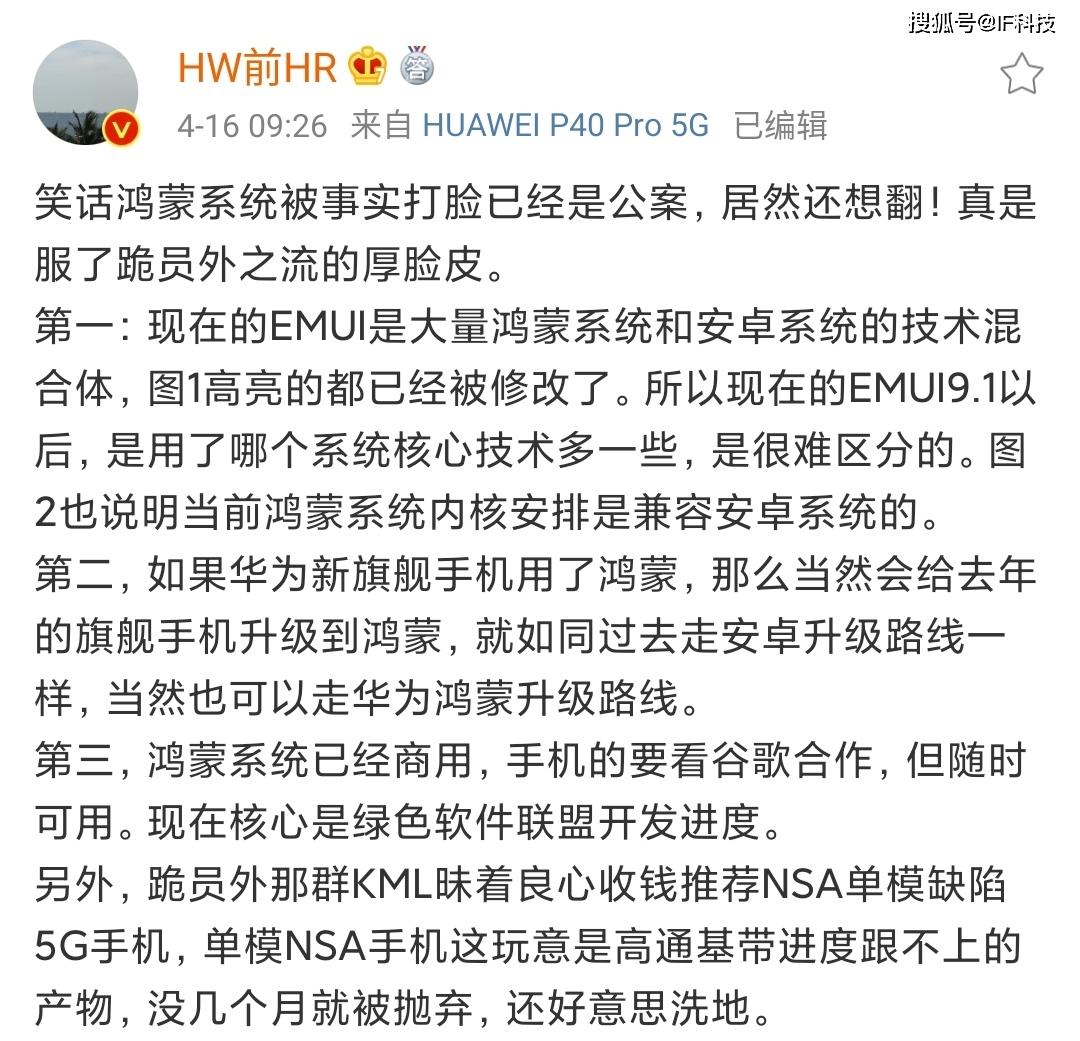 之前在华为任高管的“HW前HR”发文称“笑话鸿蒙系统被事实打脸已经是公案,居然还想翻!真是服了跪员外之流的厚脸皮。第一:现在的EMUI是大量鸿蒙系统和安卓系统的技术混合体,大部分都已经被修改了。所以现在的EMUI9.1以后,是用了哪个系统核心技术多一些,是很难区分的。当前鸿蒙系统内核安排是兼容安卓系统的。第二,如果华为新旗舰手机用了鸿蒙,那么当然会给去年的旗舰手机升级到鸿蒙,就如同过去走安卓升级路线一样,当然也可以走华为鸿蒙升级路线。第三,鸿蒙系统已经商用,手机的要看谷歌合作,但随时可用。现在核心是绿色软件联盟开发进度”。