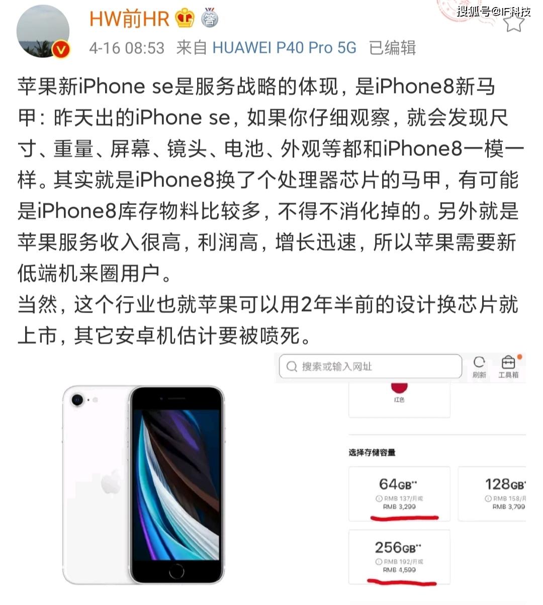 苹果新一代iPhoneSE发布后,华为前高管“HW前HR”发文爆出猛料称“苹果新iPhone se是服务战略的体现,是iPhone8新马甲:昨天出的iPhone se,如果你仔细观察,就会发现尺寸、重量、屏幕、镜头、电池、外观等都和iPhone8一模一样。其实就是iPhone8换了个处理器芯片的马甲,有可能是iPhone8库存物料比较多,不得不消化掉的。另外就是苹果服务收入很高,利润高,增长迅速,所以苹果需要新低端机来圈用户。当然,这个行业也就苹果可以用2年半前的设计换芯片就上市,其它安卓机估计要被喷死”。