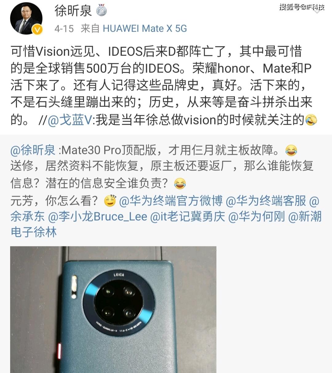 就在近日,华为前高管徐昕泉发文称Mate30 Pro顶配版,才用三个月就出现主板故障。而且送修不能恢复资料,原主板还要返厂。并质问多名华为现任高官称“那么谁能恢复信息?潜在的信息安全谁负责?元芳,你怎么看?”