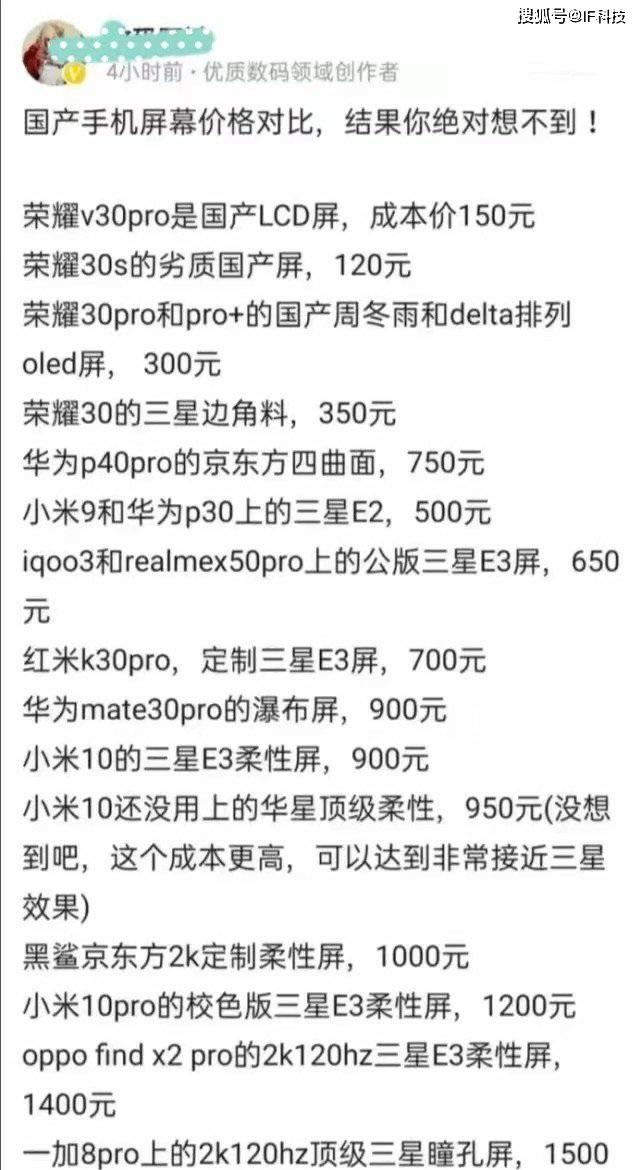 不过现在还是有一些网友因为华为旗舰机使用相较不好的屏幕而对其抨击,比如最近又有大量博主转发一个帖子,该帖子列出所有国产手机所使用的屏幕的成本,其中嘲讽荣耀高价手机使用千元低端机的屏幕,成本只有一百多元。千篇一律的转发,有网友发现可以在荣耀高管回应之前,可以搜索到万篇这样的帖子。