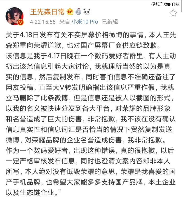 就在近日,该博主发文道歉称关于4.18日发布有关不实屏幕价格微博的事情,本人王先森郑重向荣耀道歉,也对国产屏幕厂商供应链致歉。该信息是我于4.17日晚在一个数码爱好者群里,有人主动扔出该条信息引起大家讨论,我就理所当然的以为是真实的信息,然后复制发布,同时害怕信息不准确还备注了网友投稿,直至大V转发明确指出该信息严重作假,我就立马删除了此条微博,但是信息还是被人以截图的形式,以我的名义被快速分发到各大平台,对荣耀的品牌形象和名誉造成了巨大的伤害,非常抱歉,我不该在没有确认信息真实性和信息词汇是否恰当的情况下贸然复制发送微博,对荣耀品牌的企业名誉造成伤害,我非常抱歉。作为一个数码爱好者,出现这种错误,真的很抱歉,以后一定严格审核发布信息,同时也澄清文案内容却非本人所写,本人绝对没有诋毁荣耀的意思,荣耀是我喜爱的国产手机品牌,也希望大家能多多支持国产品牌,本土企业以及生态链企业。”