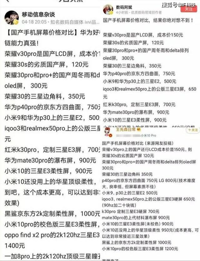 最近华为手机短时间内上了几次热搜,首先是P40pro盗用数码相机拍摄的图片充当手机拍摄,拍摄者发文痛斥后,华为立刻发文道歉。不久后P40pro因混用屏幕没有公开告诉消费者,这一段时间以来被各种博主发文嘲讽,还只做了各种“周冬雨排列”和“钻石排列”的图片,疑似嘲讽P40pro。就在近日,网上疯传一张关于最新开售国产机所采用的屏幕的成本价的图片,其中显示售价四五千的高价荣耀手机采用廉价低端屏幕。