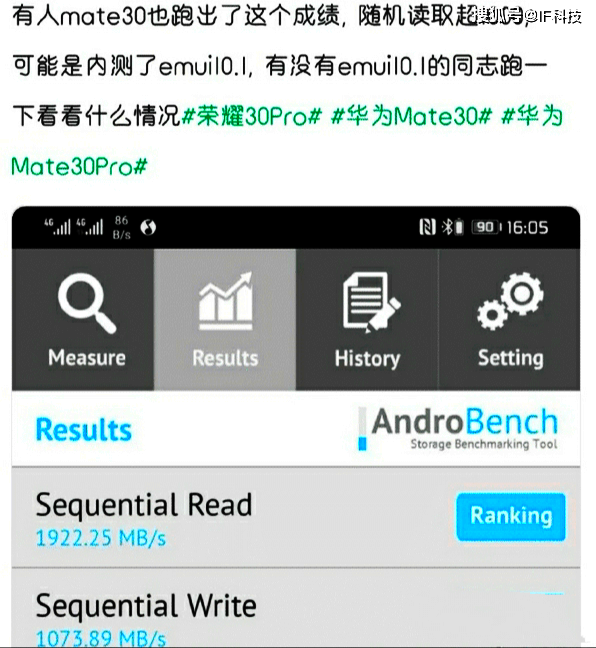 升级EMUI10.1之后,mate30的读取和写入速度果然暴涨,其中写入速度增加845MB至1073.89MB/s,读取速度增加464MB至1922.25MB/s。通过计算,写入速度最高翻了4.7倍,通过对比,这个速度已经相当于LPDDR5运行内存还有的规格,不得不说emui10.1系统太给力了。