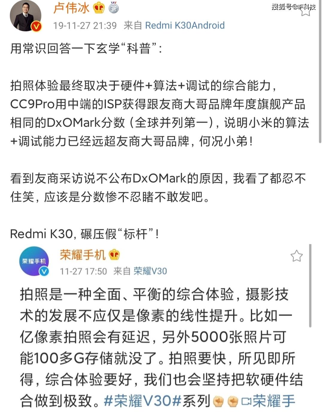 卢伟冰还说友商通过“诡辩”方式宣传wifi5比wifi6快,骁龙865不支持5G网络等等,并直接公开宣称友商V30系列就是一场“玄学”发布会,比如用“矩阵式相机”等词语进行玄学。相信关注国内手机圈的网友都知道,卢总在前段时间,每天发多条动态抨击华为技术落后,省成本,套娃机等。目前小米和华为已经成为手机行业水火不容的两个国产品牌。