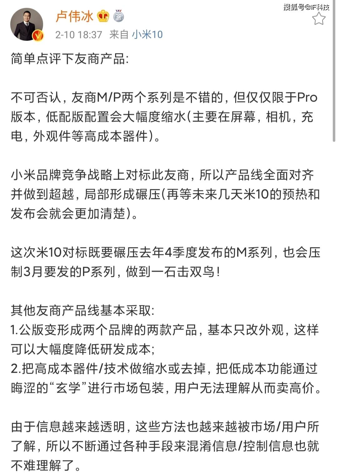对于华为宣称自家手机技术遥遥领先友商的说法,第一个不认同的是小米,小米认为目前所有智能手机使用的硬件都是供应商提供的,华为拿到最新硬件的速度不如其它厂商,包括小米,所以卢伟冰多次发文抨击华为所谓的技术先进是通过“玄学”出来,比如抨击华为最新手机仍然使用上一代LPDDR4X,ARM上一代A76和G76核心,然后通过“玄学”得出这些落后的技术领先LPDDR5和G77、A77核心。