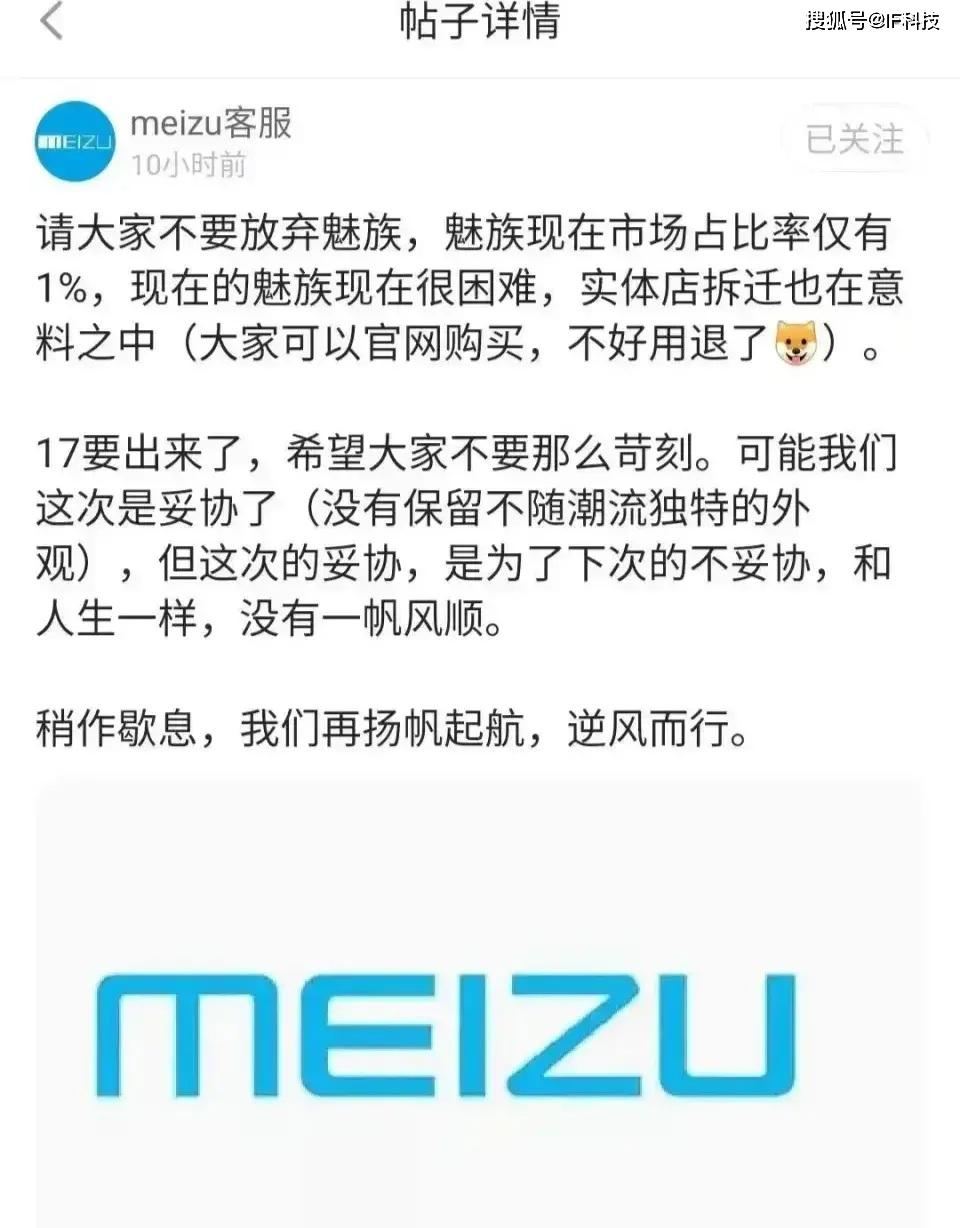 那么魅族手机销量会是多少呢,就在近日,魅族客服发帖称“请大家不要放弃魅族,魅族现在市场占比率仅有1%,现在的魅族现在很困难,实体店拆迁也在意料之中。17要出来了,希望大家不要那么苛刻。可能我们这次是妥协了(没有保留不随潮流独特的外观),但这次妥协了,是为了下次的不妥协,和人生一样,没有一帆风顺。稍作歇息,我们扬帆起航,逆风而行”。根据国际知名统计机构公布的数据,2019年国内智能手机总销量是3.69亿台,魅族占有率1%那就是369万台,也就是一个月仅卖10多万台,这个销量确实惨淡,已经不如一加,和三星在国内销量的差距更大。