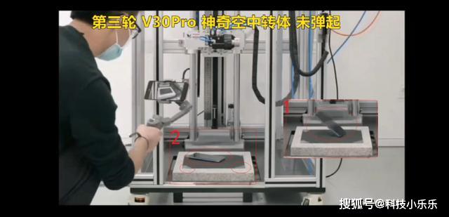 在第二轮测试中,V30Pro直上直下,背部着地,没有任何弹起;而K30Pro,着地之后立马弹起,之后反转一周屏幕着地。