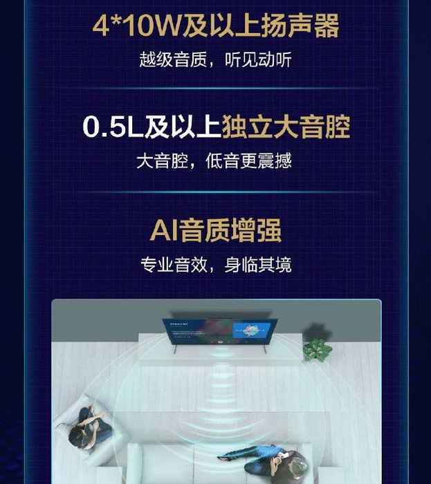 音质方面,荣耀定下的标准是4*10W及以上的扬声器,0.5L及以上的独立大音腔,并支持AI音质增强,而小米电视产品则一直都使用的是祖传2*8W扬声器产品,扬声器的音腔也不是太大,在音质上完全是被荣耀智慧屏产品按地上摩擦。