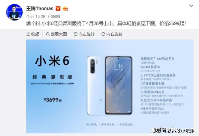 除了苹果以外,今天国内的很多厂商或者他们的粉丝都来了一波愚人的宣传庆祝愚人节,有不少小伙伴上当了呢,小米王腾发微博表示小米6的经典复刻版将于4月28日上市,售价3699元,图中可以看出配置还相当豪华,什么一亿像素镜头,2K 90Hz三星屏,65W超级闪充,这一看就是假的了哈哈。