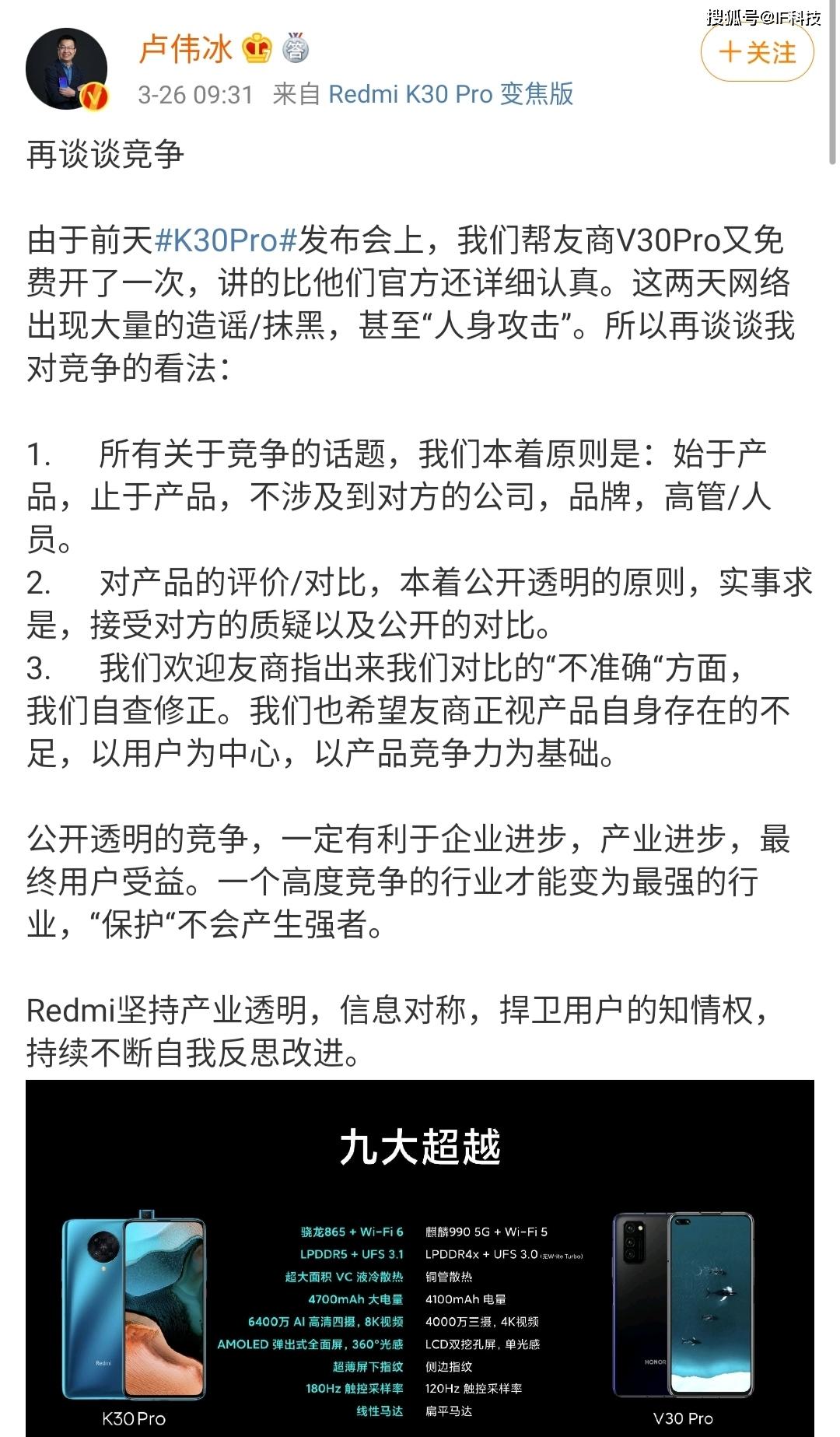 就在刚刚,卢伟冰发文抨击友商开始进行大量的造谣和抹黑,甚至“人身攻击”。卢总首先说“由于前天K30Pro发布会上,我们帮友商V30Pro又免费开了一次,讲的比他们官方还详细认真。这两天网络出现大量的造谣/抹黑,甚至“人身攻击”,所以再谈谈我对竞争的看法”。