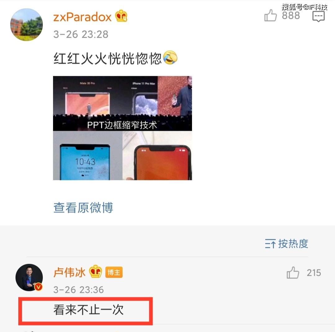 后来又网友找来Mate30Pro当时在发布会上的渲染图,与真机差别同样很大,卢伟冰回复称看来不止一次。值得一提的是,余承东将P40Pro与苹果11ProMax进行边框对比,后者顶部边框宽度为4.5mm,前者仅为2.65mm,差值为1.85mm,然而差值的宽度比2.65mm还要宽,显然这个边框对比不可信,而且P40Pro渲染图几乎没有边框,真机边框很宽。