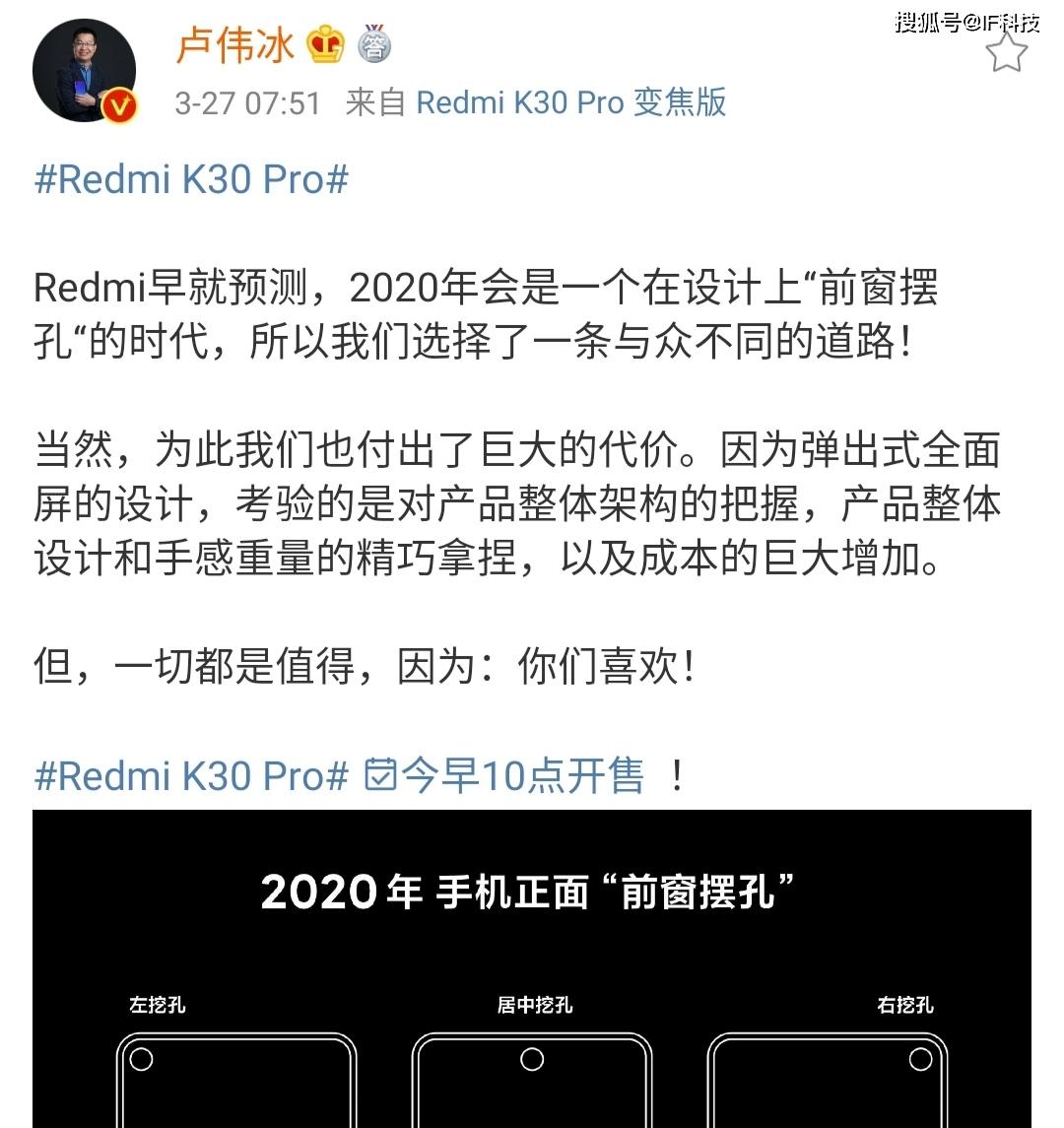 P40系列发布后,HW前HR快速删除动态,现在很多网友在其动态中评论“大窟窿”都会被拉黑。卢伟冰发文嘲讽称今晚学了一个词:屏幕大窟窿!我还是喜欢完完整整的一块屏,干干净净,清清爽爽。Redmi早就预测,2020年会是一个在设计上“前窗摆孔“的时代,所以我们选择了一条与众不同的道路!当然,为此我们也付出了巨大的代价。因为弹出式全面屏的设计,考验的是对产品整体架构的把握,产品整体设计和手感重量的精巧拿捏,以及成本的巨大增加。